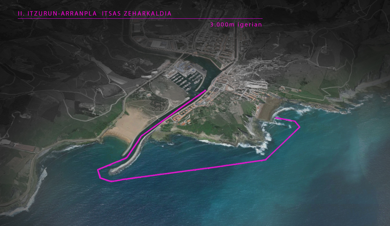 El recorrido combina la travesía por mar abierto con la travesía por la ría del Urola con una distancia total de 3.000 m, de los cuales aproximadamente 2 Km son por mar abierto y 1 Km por la ría.